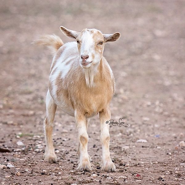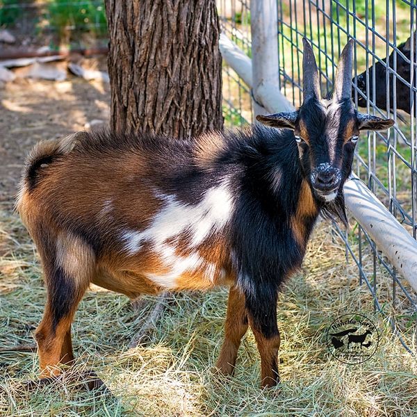 Stormy is horned, buckskin with moonspots and blue eyes. Dual Registered